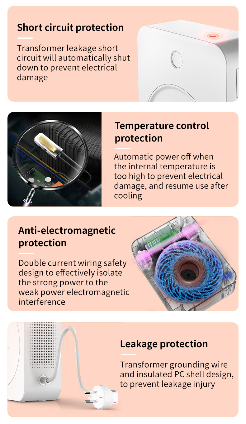 The shell and internal power cord of this voltage converter are all made of flame retardant materials, which greatly reduces the risk of fire during use. In addition to the flame retardant design, this transformer is also equipped with multiple protection devices such as temperature control protection, overload protection and short circuit protection. Together, these measures ensure safety during use and effectively prevent safety accidents caused by unstable voltage or overload.
