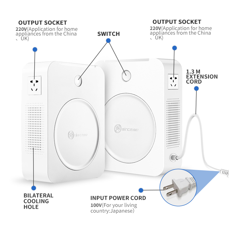 За одличне јапанске пегле за косу, апарате за пару лица, радиофреквентну опрему за лепоту и другу опрему за козметичке салоне, обично морају да раде исправно на 220 В. Овај претварач напона може да претвори локални напон од 100В у 220В који захтева ова опрема козметичких салона, тако да можете уживати у одржавању висококвалитетних производа козметичких салона без одласка у Европу.